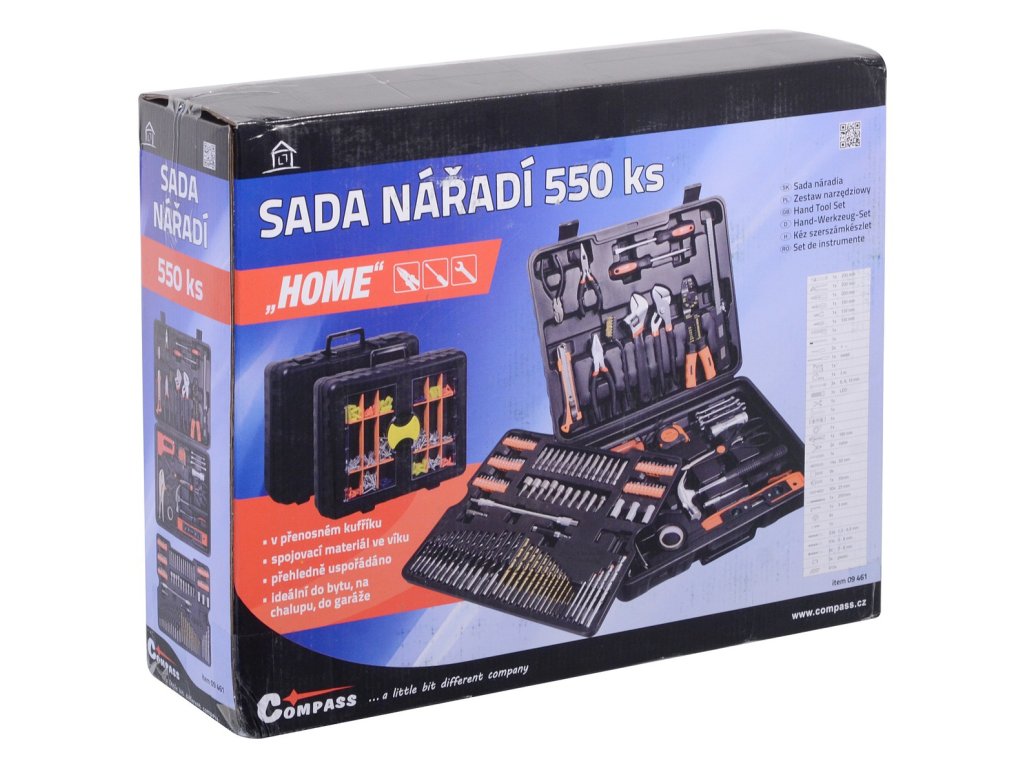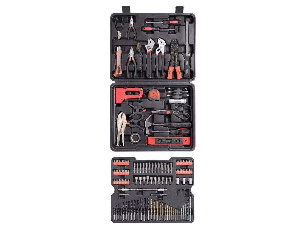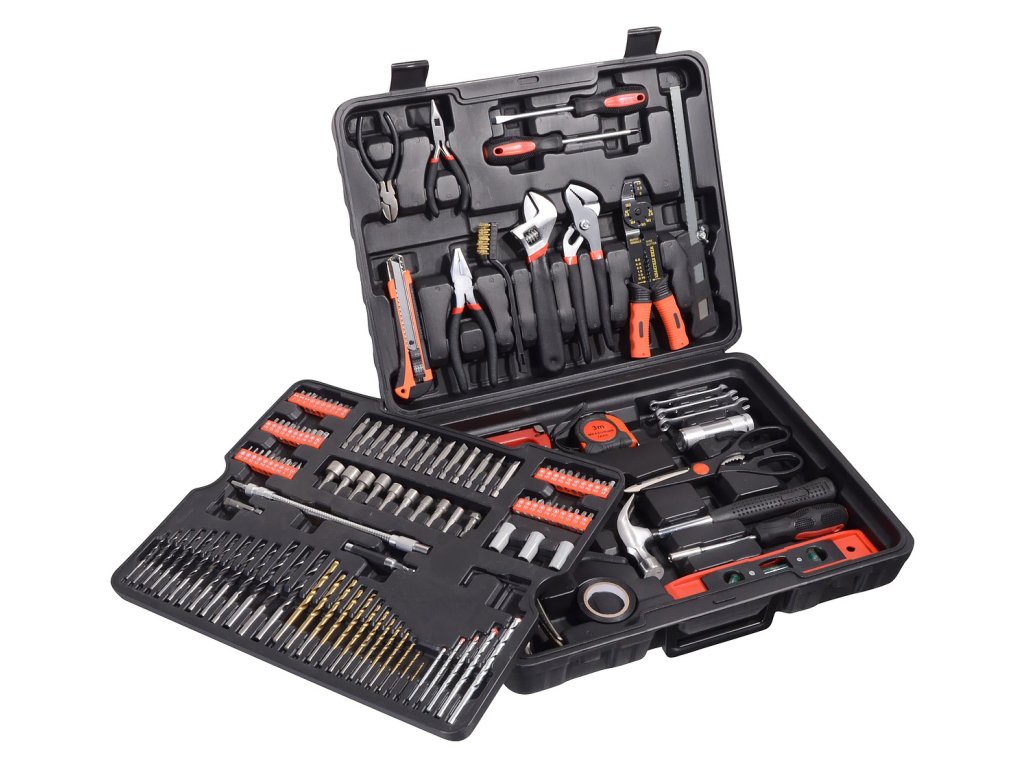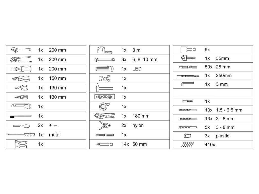 Sada obsahuje celou řadu vrtáků, bitů, nástrčných klíčů, šroubováky, kleště, kladivo, vodováhu, stranové klíče, základní spojovací materiál a celou řadu dalšího nářadí, které je vhodné pro použití jak doma, v garáži, tak i na cestách.