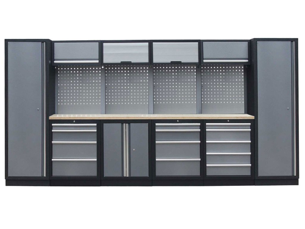 Sestava nábytku v sobě skrývá dostatečné množství úložného prostoru pro vaše nářadí, autotechniku i dílenské vybavení. V kombinaci s bytelnou pracovní deskou získáte multifunkční stěnu, se kterou vám půjde práce od ruky ve všech směrech.