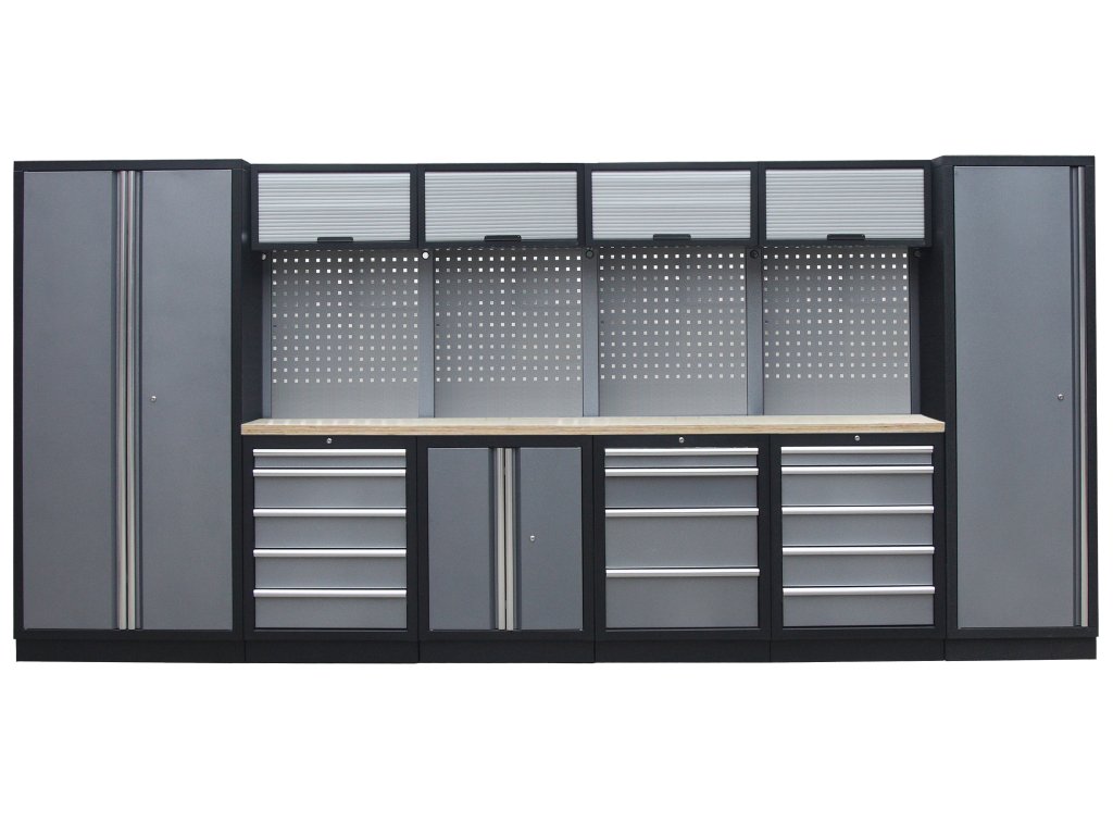 Sestava nábytku v sobě skrývá dostatečné množství úložného prostoru pro vaše nářadí, autotechniku i dílenské vybavení. V kombinaci s bytelnou pracovní deskou získáte multifunkční stěnu, se kterou vám půjde práce od ruky ve všech směrech.