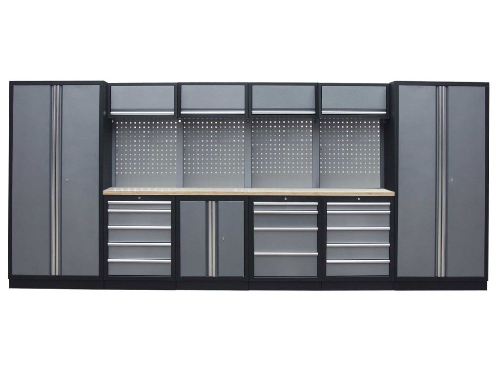 Sestava nábytku v sobě skrývá dostatečné množství úložného prostoru pro vaše nářadí, autotechniku i dílenské vybavení. V kombinaci s bytelnou pracovní deskou získáte multifunkční stěnu, se kterou vám půjde práce od ruky ve všech směrech.