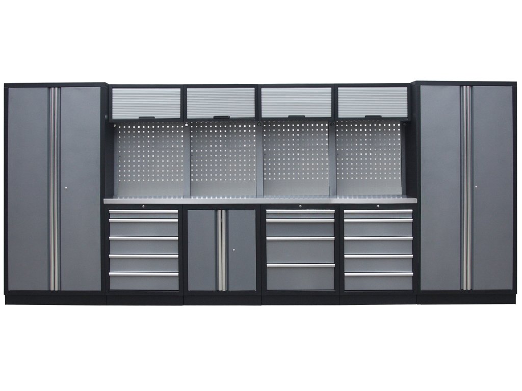 Sestava nábytku v sobě skrývá dostatečné množství úložného prostoru pro vaše nářadí, autotechniku i dílenské vybavení. V kombinaci s bytelnou pracovní deskou získáte multifunkční stěnu, se kterou vám půjde práce od ruky ve všech směrech.