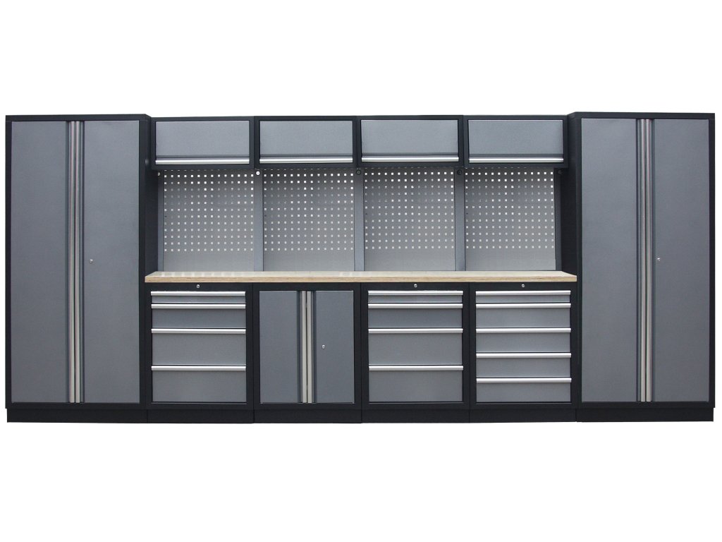 Sestava nábytku v sobě skrývá dostatečné množství úložného prostoru pro vaše nářadí, autotechniku i dílenské vybavení. V kombinaci s bytelnou pracovní deskou získáte multifunkční stěnu, se kterou vám půjde práce od ruky ve všech směrech.