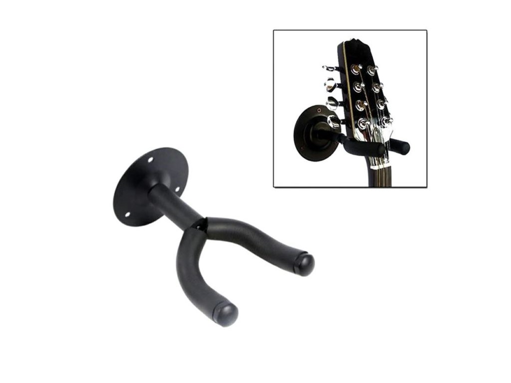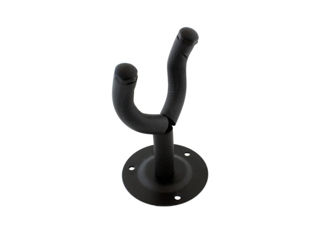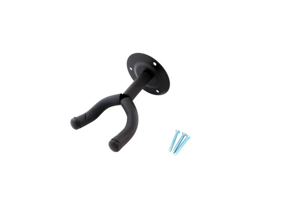 Kytarový věšák černý Univerzální kovový věšák vhodný pro všechny typy kytar. Vidlice je opatřena pogumovanou vrstvou, tak aby nedošlo k poškození laku kytar. Šrouby k připevnění věšáku jsou součástí balení.Parametry