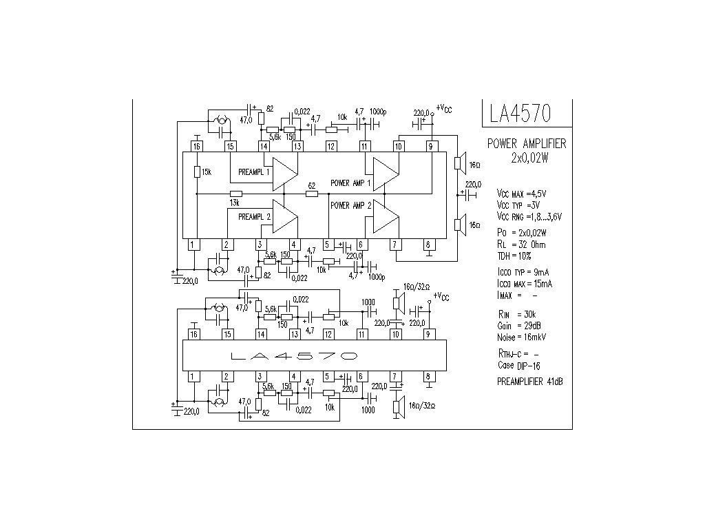 LA4570 - stereo předzesilovač + nf zesilovač 2x0,02W,Ucc=1,8-3,6VDoplňkové parametry