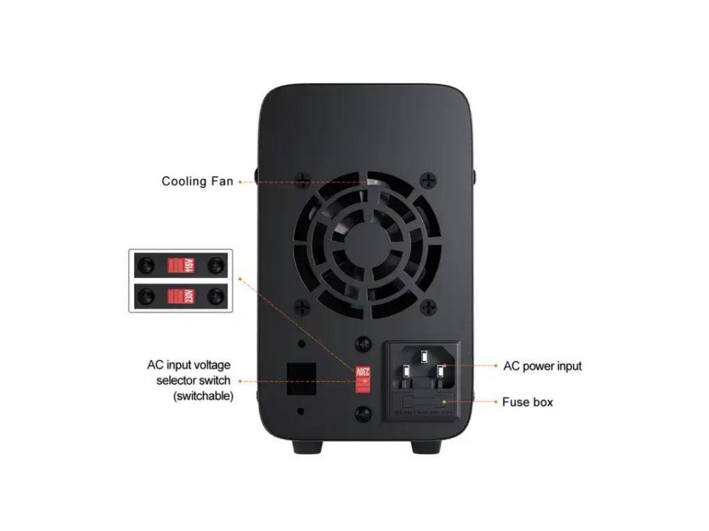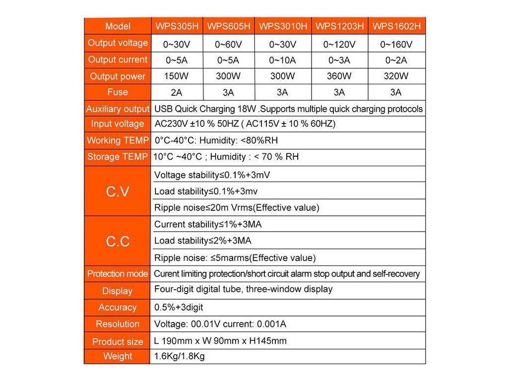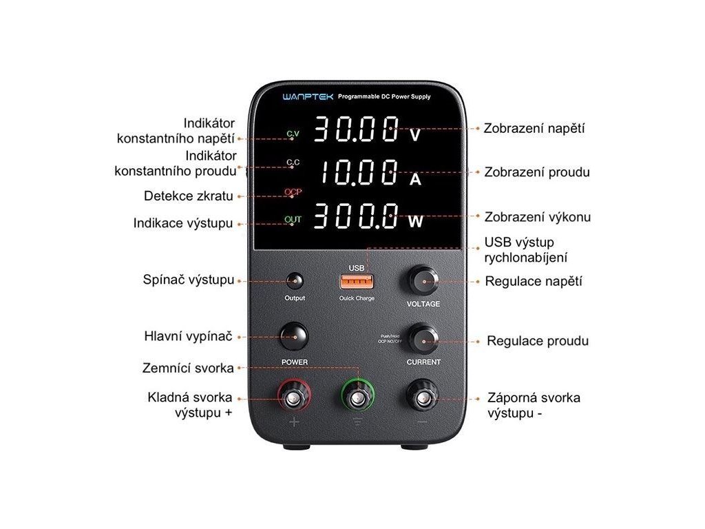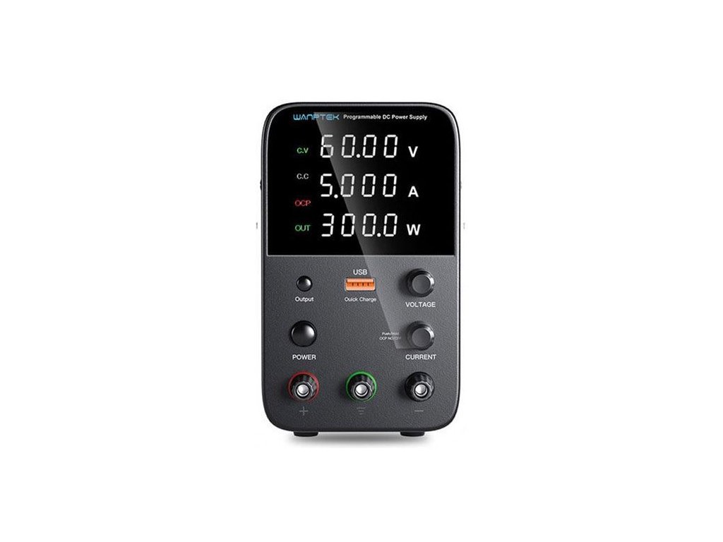 Laboratorní zdroj WPS605H 0-60V/0-5A Spínaný laboratorní zdroj WPS3010H je určen k napájení externích zařízení stejnosměrným proudem. Digitální displej současně zobrazuje výstupní napětí, proud a výkon. Napětí a maximální proud jsou nastavitelné i velmi jemně - napětí po 10mV (nad 10V po 100mV) a proudu po 10mA. Zařízení disponuje ochranou proti přehřátí, přepětí, nadproudu a zkratu. O chlazení zdroje se stará tichý, teplotou řízenýventilátor. Stabilitu zajišťují gumové nožičky a zároveň chrání stůl před poškrábáním. Zdroj má také USB port s funkcí rychlého nabíjení.**Specifikace:**