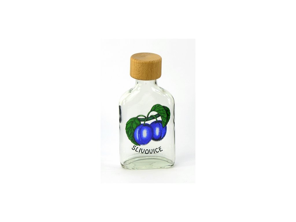 Láhev tvar Placka s dekorem švestka slivovice je ideální na destiláty.Objem 100 ml, výška včetně dřevěného závitového víčka je 13.5 cm.