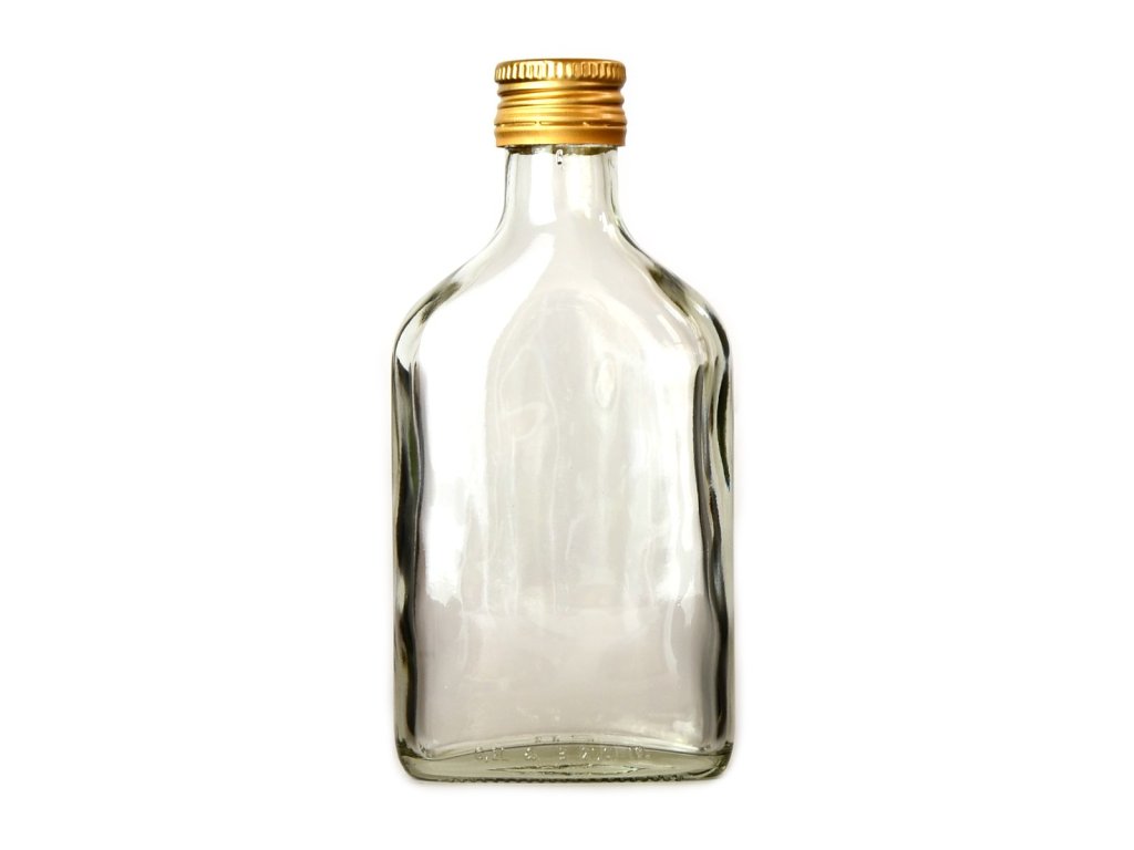 Skleněná láhev Placka s plechovým víčkem ( pleskačka / placatice / placatka ) je ideální na destiláty, jako dárek nebo vlastní použití.Objem 200 ml, šroubovací uzávěr PP 28mm.