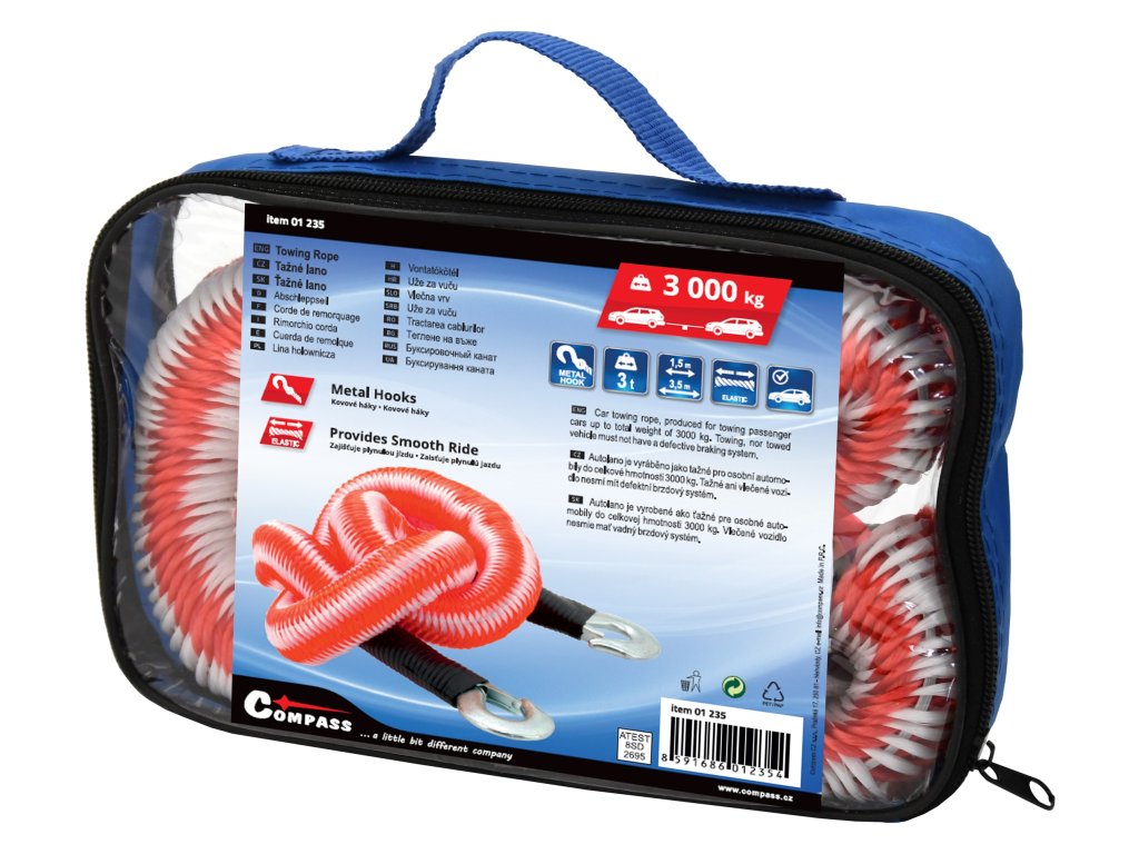 Pružné autolano, tažné lano pro osobní automobily do celkové hmotnosti 3000 kg. Lano je uloženo v praktické na zip uzavíratelné brašně.