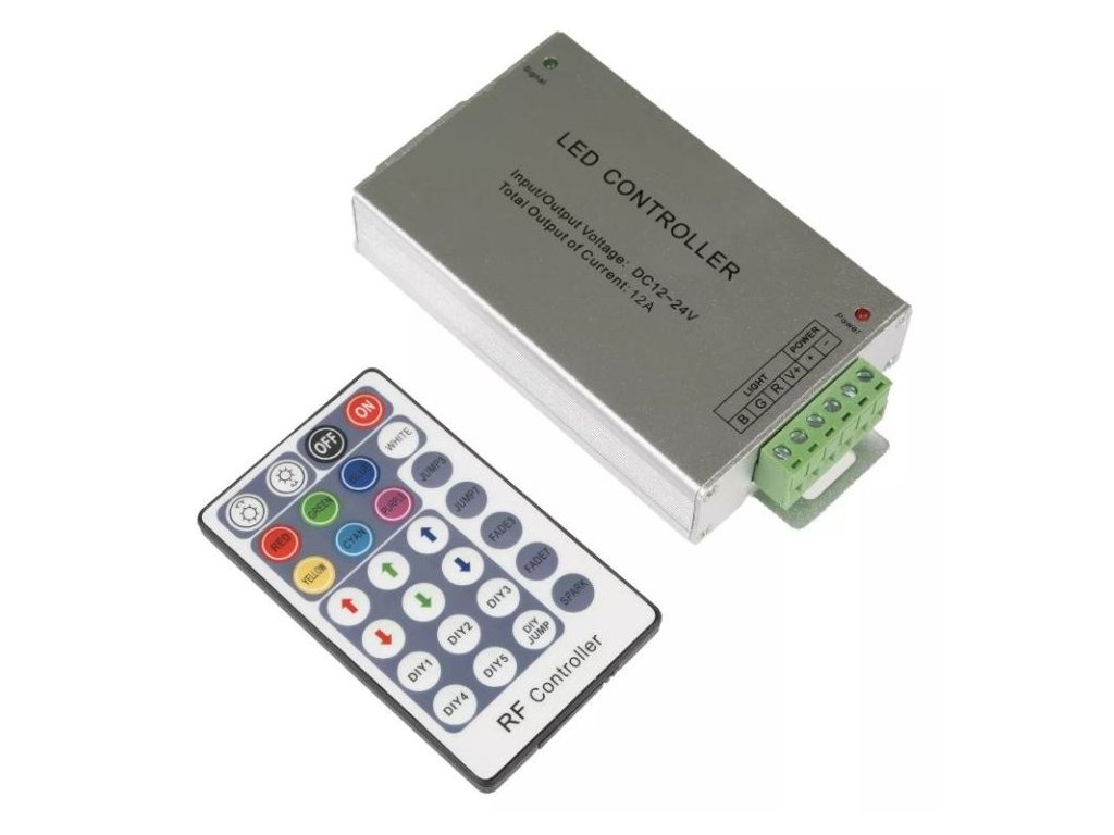 LED ovladač RGB-RF6-28B, 433MHz Programovatelný ovladač pro RGB LED pásky - RF (radiofrekvenční ovládání) umožňuje dálkově ovládat intensitu jasu, nastavení barev, barevných přechodů a jejich rychlost u RGB LED pásků a modulů. Přijímač může být ukrytý (za zdí, sádrokartónem či ve skříni), není nutná přímá viditelnost přijímače pro ovladač.Lze připojit až 20 m RGB LED pásku 30LED/1m nebo 10m 60LED/1m.