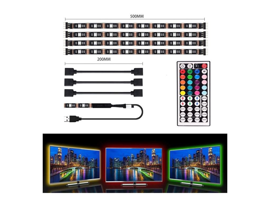 LED RGB pásek podsvícení 4 x 50 cm, USB Sada čtyř RGB LED pásků k osvětlení stěna za televizorem.Pohodlné a energeticky úsporné (napájeno z USB).