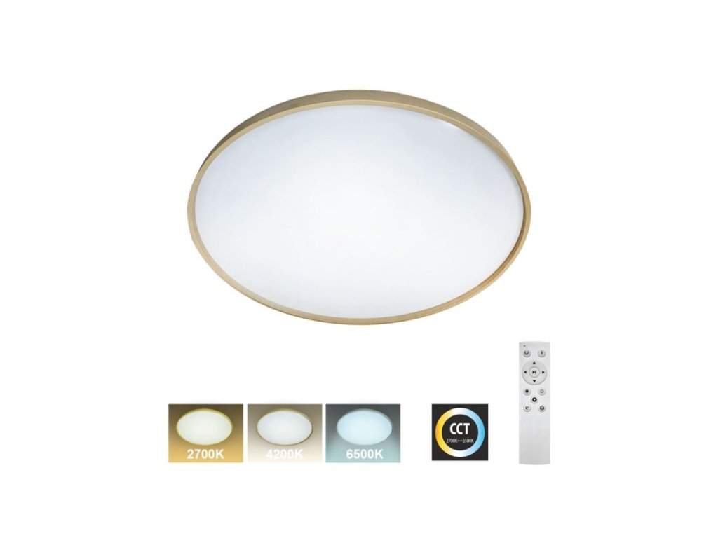 LED stropní svítidlo - DRINA 36W CCT + ovladač, Trixline TR-616C LED stropní svítidlo TR-616C - DRINA Trixline ve zlaté barvě je určeno do vnitřních prostor jako jsou obývací pokoje, ložnice, haly, kanceláře, chodby a podobná místa. Pomocí přiloženého ovladače můžete přepínat mezi třemi světelnými teplotami v rozmezí 2700K až 6500K, které lze stmívat dle potřeby pro navození příjemné atmosféry. Při maximálním ztlumení klesá spotřeba až na pouhých 6W z původních36W, což zaručuje úsporu energie. Další možností na dálkovém ovladači je i noční režim a funkce 30 vteřin po jejichž uplynutí se LED svítidlo samo vypne. Svítidlo si po vypnutí pamatuje poslední nastavený režim, což zajišťuje pohodlné a intuitivní používání.Klíčové vlastnosti: