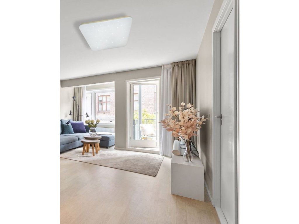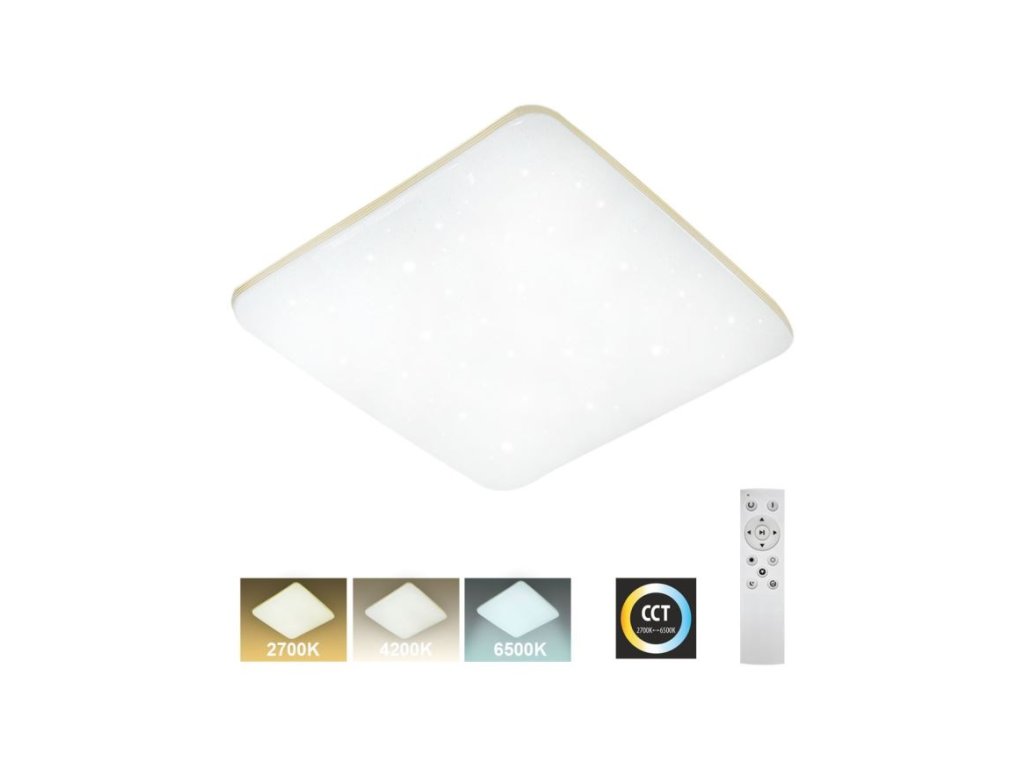 LED stropní svítidlo - MANA 60W CCT + ovladač, Trixline TR-615S LED stropní svítidlo TR-615S - MANA Trixline v bílé barvě se čtyřmi zlatými proužky po obvodu a třpytivým světelným efektem. Svítidlo má variabilní design, kdy můžete odejmout zlaté proužky a ponechatpouze čistě bílé okraje. Je určeno do vnitřních prostor jako jsou obývací pokoje, ložnice, haly, kanceláře, chodby a podobná místa. Pomocí přiloženého ovladače můžete přepínat mezi třemi světelnými teplotami v rozmezí 2700K až 6500K, které lze stmívat dle potřeby pro navození příjemné atmosféry. Při maximálním ztlumení klesá spotřeba až na pouhých 8W z původních 60W, což zaručuje úsporu energie.Další možností na dálkovém ovladači je i noční režim a funkce 30 vteřin po jejichž uplynutí se LED svítidlo samo vypne. Svítidlo si po vypnutí pamatuje poslední nastavený režim, což zajišťuje pohodlnéa intuitivní používání.V nabídce máme světlo MANA také ve variantě TR-614S - MANA 36W 3420lm 43x43cm