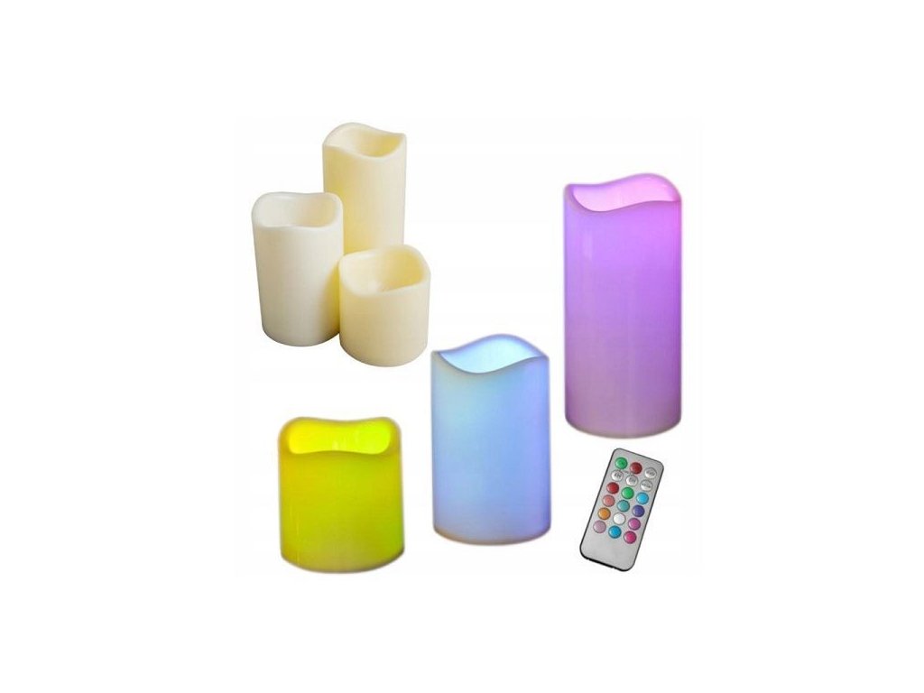 Specifikace:<BR/>Bez ohně<BR/>Nepřetržité světlo nebo blikání<BR/>Dálkový ovladač umožňuje měnit barvy (12 barevných tlačítek)<BR/>Možnost více barev<BR/>Možnost časovače na 4/8 hodin<BR/>Zapínač / vypínač na svíčkách a dálkovém ovládání<BR/>Rozměry svíčky:<BR/>Největší: 15 x 7,5 cm<BR/>Střední: 10 x 7,5 cm<BR/>Nejmenší: 7,5 x 7,5 cmDoplňkové parametry