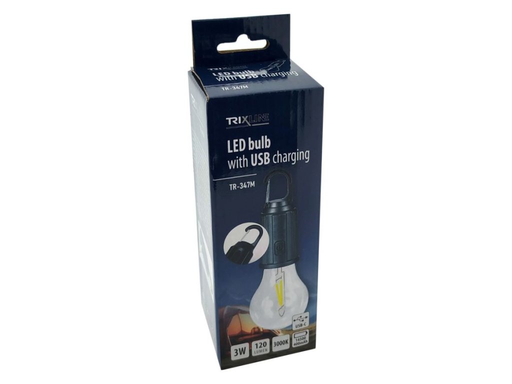 LED žárovka s USB nabíjením 3W 3000K Trixline TR-347M, camping Praktická a úsporná LED žárovka s integrovanou dobíjecí baterií a nabíjením přes USB port je ideálním pomocníkem na cesty, do stanu, na chatu nebo jako nouzové osvětlení do domácnosti. Teplé bílé světlo (3000K) vytváří příjemnou atmosféru a 3W výkon zajišťuje dostatečné osvětlení prostoru bez zbytečné spotřeby energie.Díky integrované karabině ji snadno zavěsíte kamkoliv – na větev, háček nebodo stanu. Je lehká, kompaktní a připravená k použití kdykoliv a kdekoliv.