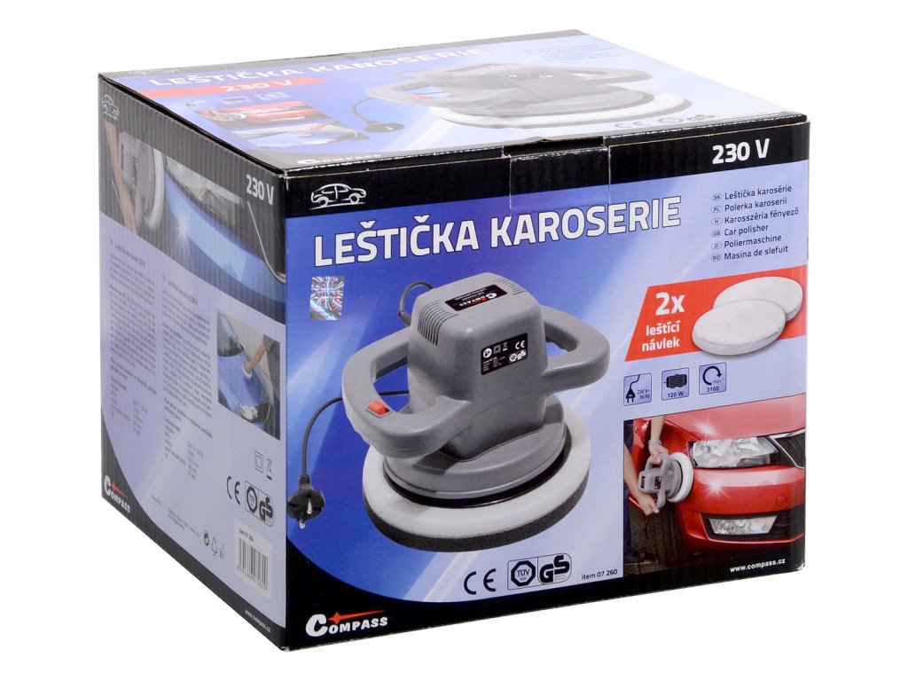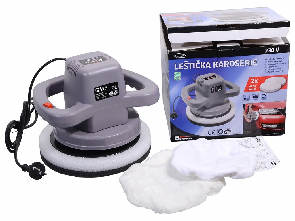 Leštička karosérií usnadňuje leštění a ošetřování karosérií automobilů i jiných ploch, u kterých se takové zákroky provádějí. Napájení 230 V, vyměnitelné leštící potahy kotouče pro nanášení i leštění. Součástí balení jsou i dva kryty (návleky) na leštičku.