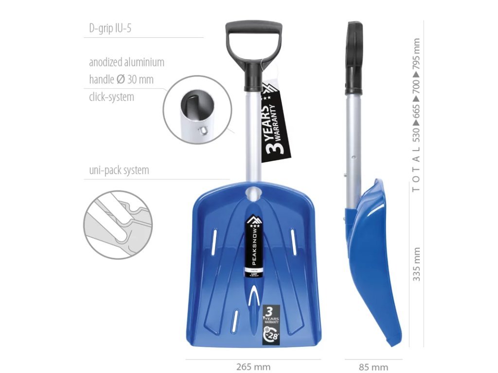 Lopata na sníh do auta s hliníkovou teleskopickou násadou zakončenou ergonomickou rukojetí. Praktický pomocník nejen do auta, kde se stane neocenitelným pomocníkem v případě zapadnutí v hlubokém sněhu či zasněžení auta přes noc. Využití najde také u milovníků zimních sportů. Stavba skokánků pro lyžaře a snowboardisty nebo nouzových přístřeší pro turisty a horolezce.