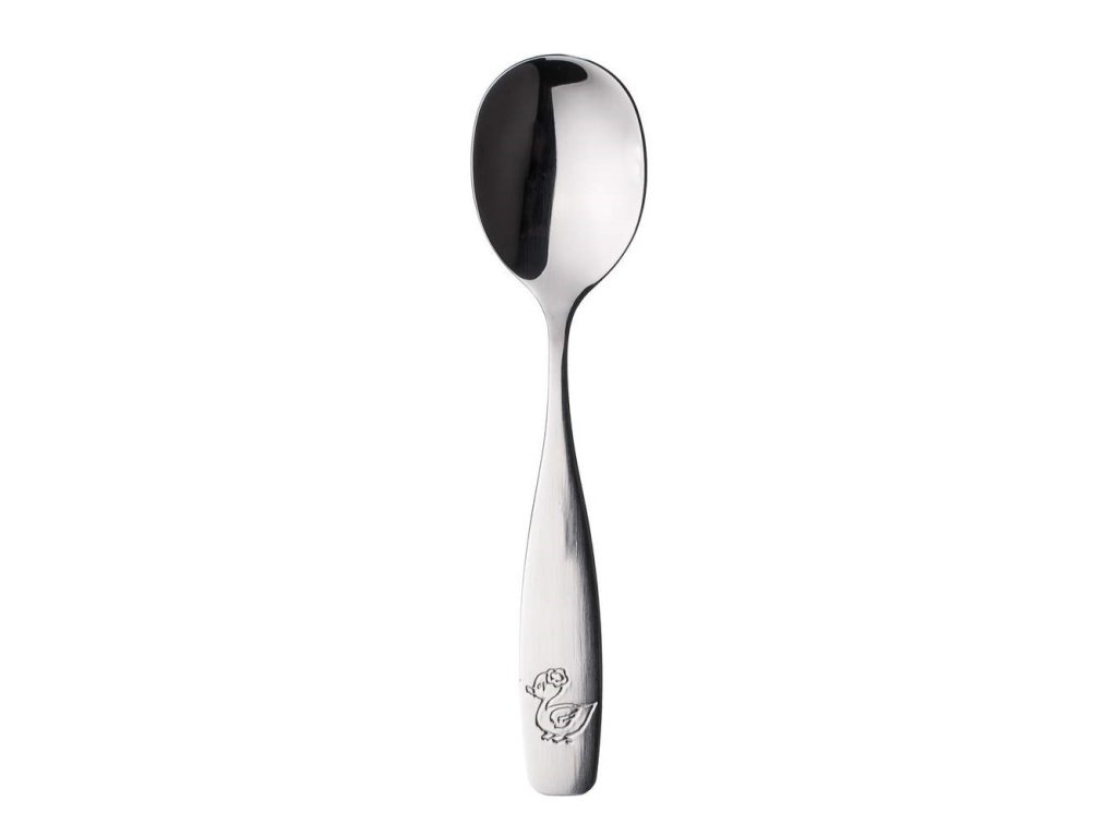 Dětská příborová lžíce vybená z leštěné oceli 18/0 s vyraženým motivem zvířátka.Délka 14 cm, síla materiálu 2 mm.