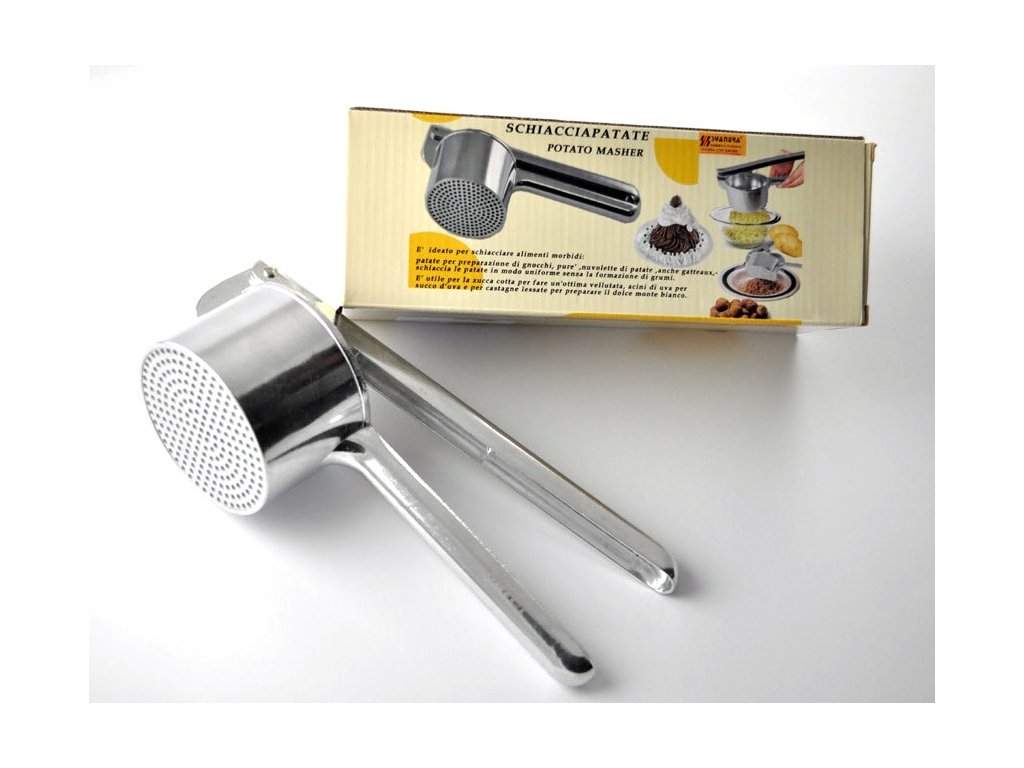 Kvalitní pevné mačkadlo vyrobené z chromovaného hliníku, slouží k lisování vařeného ovoce, zeleniny, brambor a škvarků.Lisovací otvory průměr 2 mm.