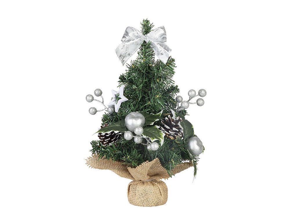 Malý vánoční stromek je zdoben stříbrnými ozdobami, šiškami a elegantní mašlí, díky čemuž působí přirozeně a zároveň slavnostně.