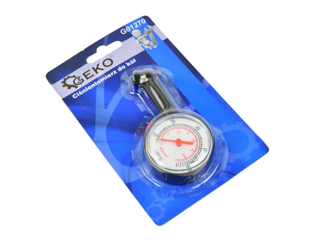 Analogový manometr s ventilem, rozsah 0-3,5 bar (0-50 psi), 45° natočení - GEKO G01270.Manometr je navržen pro měření tlaku v pneumatikách kol, motocyklů, automobilů atd.
