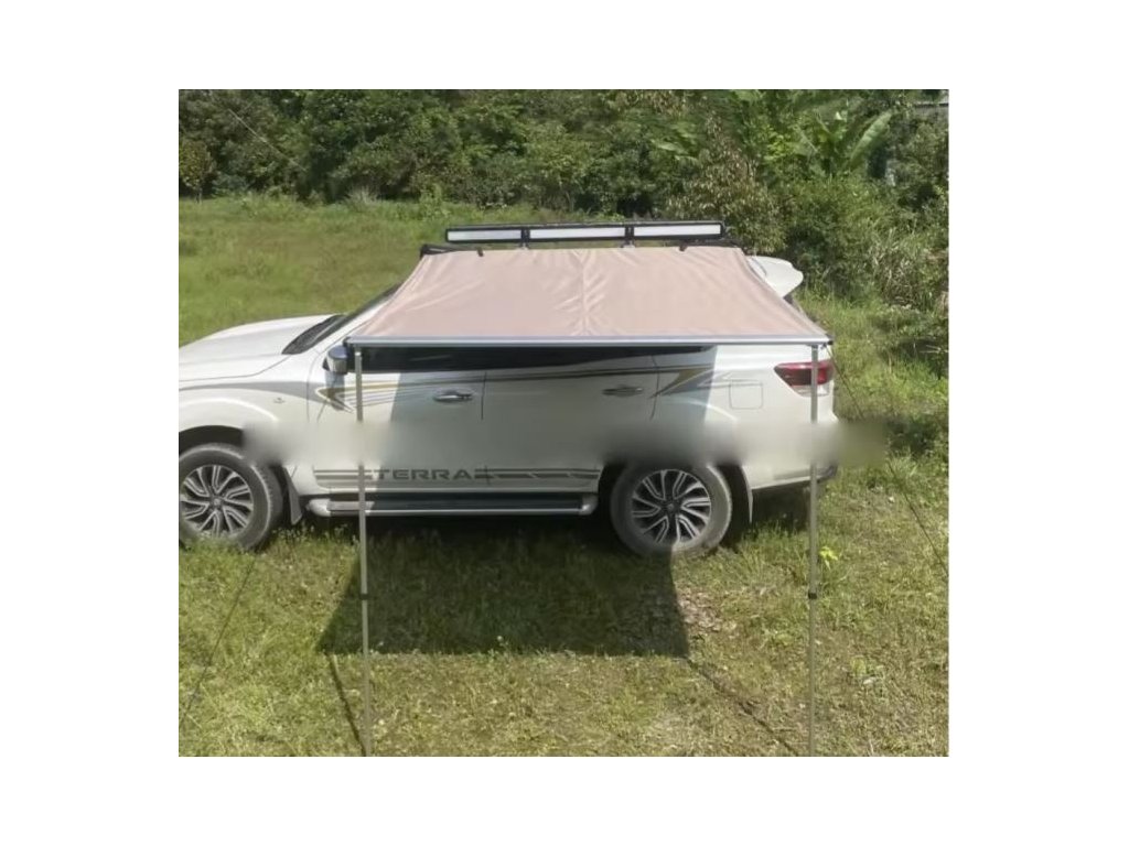 Markýza na auto boční černá/písková 2x2,5m Markýza na bok auta z vysoce odolného Oxford materiálu s hodnotou vodního sloupce 2000mm, montážní ocelové Lka například na příčníky.Markýza se připevňuje na střešní nosič nebo na nosníky.Sada obsahuje roletu, montážní držáky a kryt.