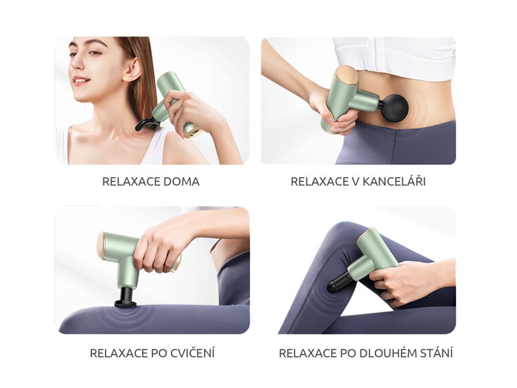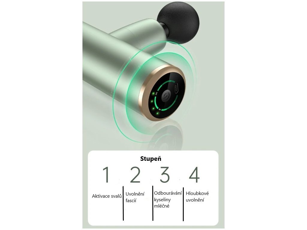 Masážní pistole umožňuje individuální nastavení díky čtyřem rychlostním stupňům, které umožňují přechod od jemného uvolnění až po intenzivní hlubokou svalovou masáž:
