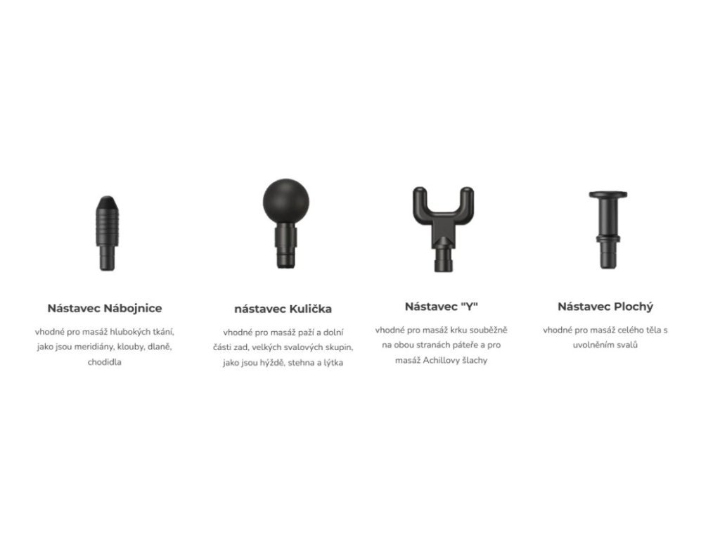 Balení obsahuje čtyři vyměnitelné masážní nástavce, které umožňují cíleně ošetřit různé svalové partie – od velkých svalových skupin až po těžko dostupné body. Každý nástavec je navržen s ohledem na specifické potřeby pro maximální efektivitu masáže.