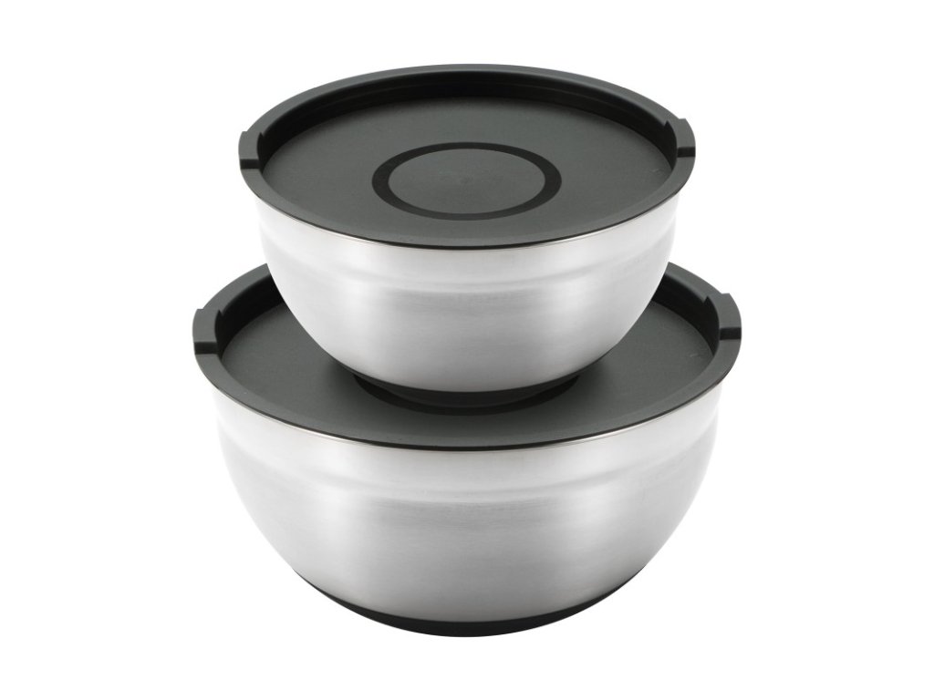 Dvě nerezové mísy s víčky jsou ideální pomocníci pro každodenní použití v kuchyni. Díky kvalitnímu zpracování a chytrým detailům poslouží při přípravě těsta, salátů, marinád i uchovávání potravin.