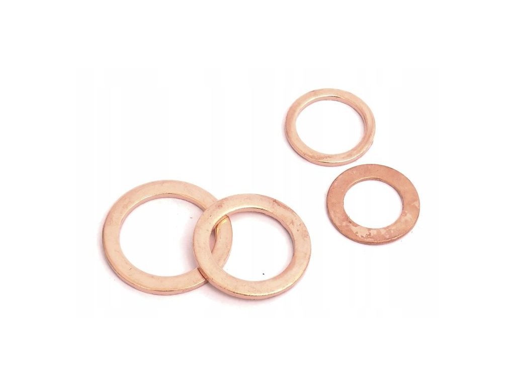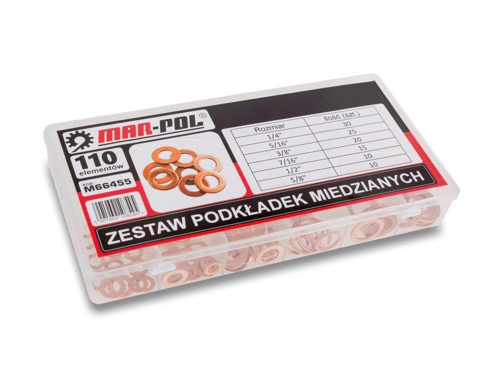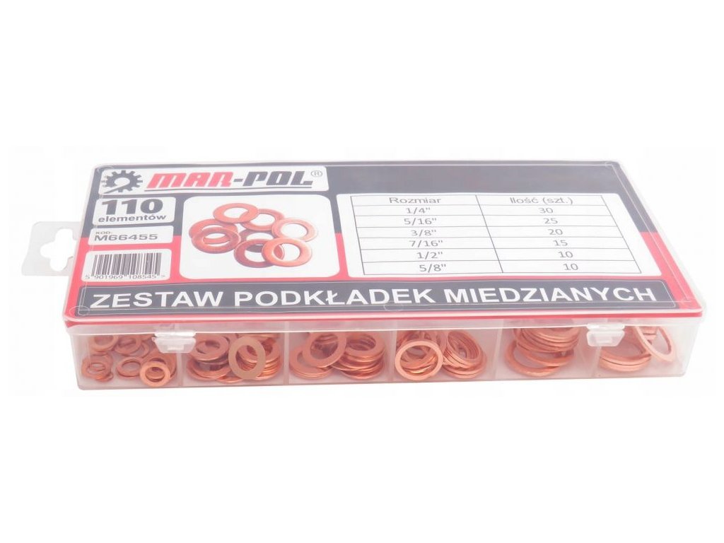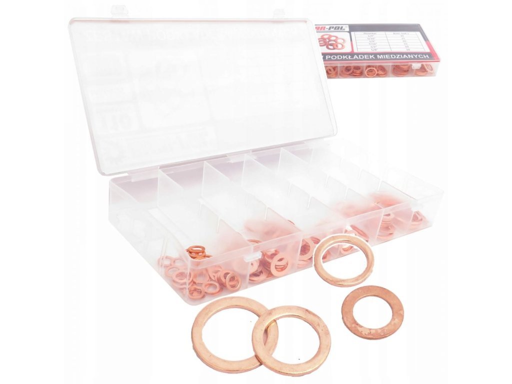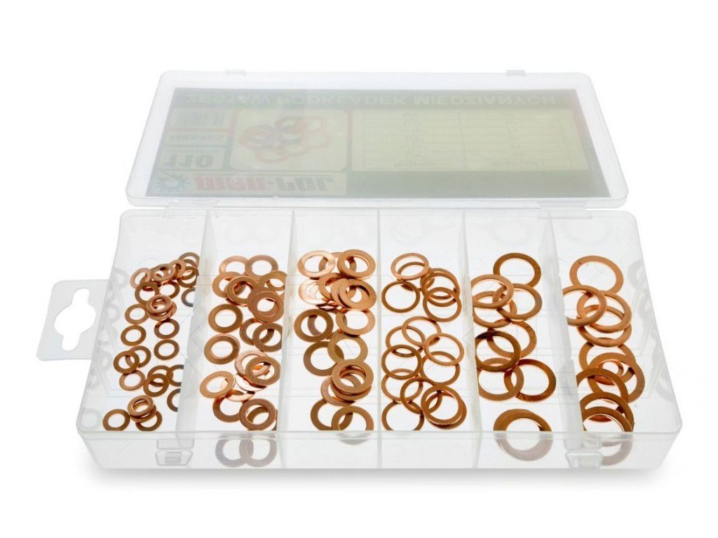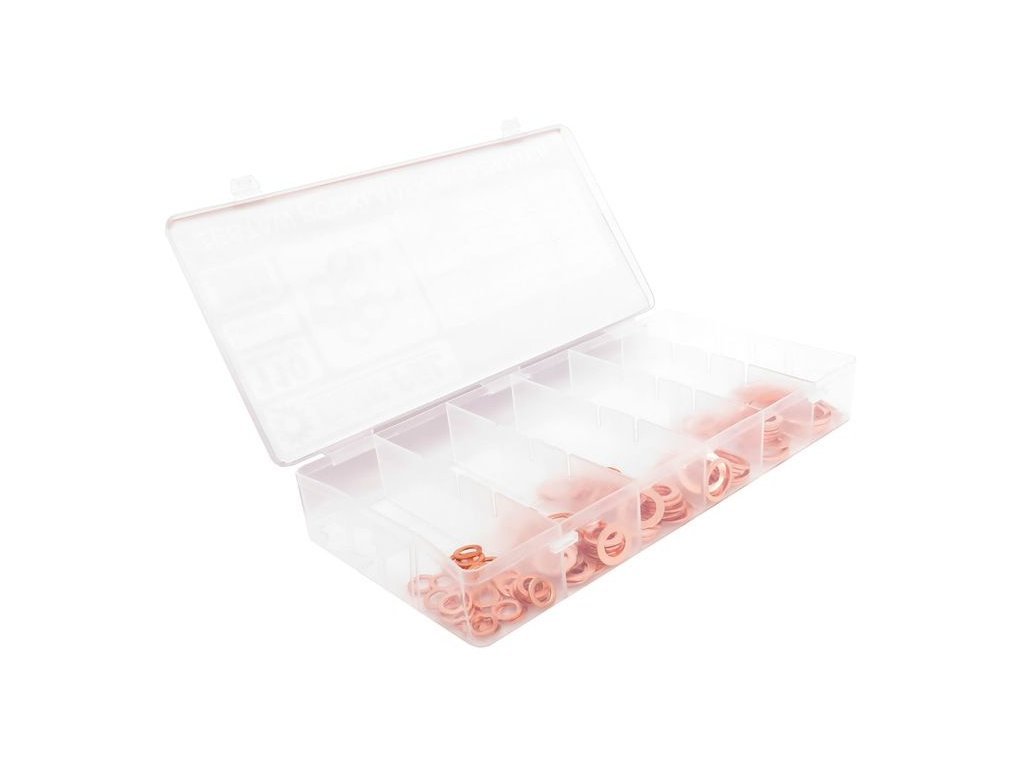 Sada 110ks měděných podložek různých rozměrů umístěná v praktickém plastovém boxu s přihrádkami.