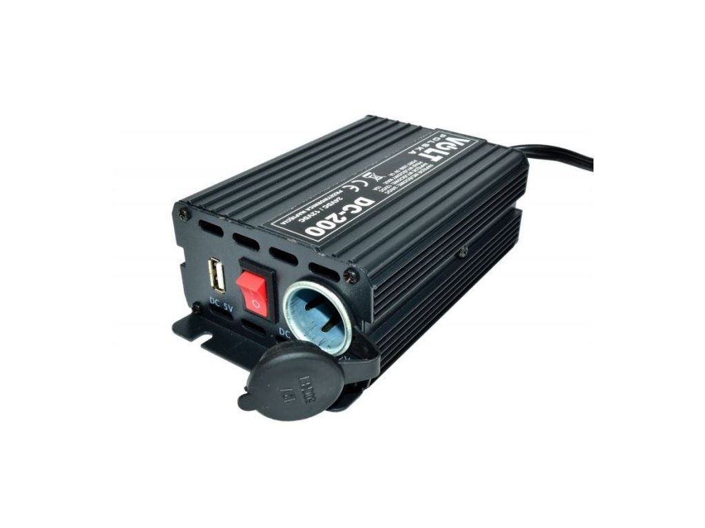 Měnič napětí 24/12V DC 15A, USB, VOLTPOLSKA DC200 Spínaný zdroj 24VDC/12VDC zajistí provoz 12V spotřebičů z baterie 24V s účinností cca 90% napájení 21-30VTrvalý výstupní proud 15A + - 1 AMaximální okamžitý výstupní proud 20 A