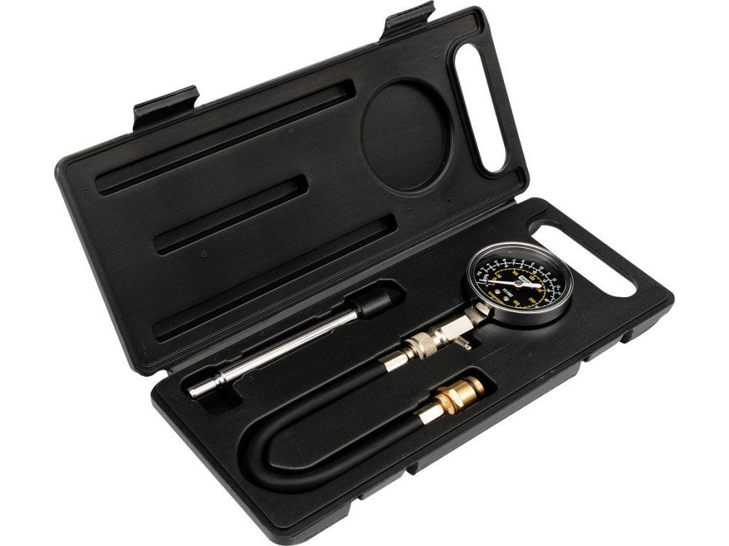 Zařízení se umístí místo zapalovací svíčky motoru a určí se tlak pro daný válec. Sada je opatřena nástavcem s gumovým zakončením a také hadičkou se zakončením se závitem pro montáž u motorů s hluboko zapuštěnými svíčkami.