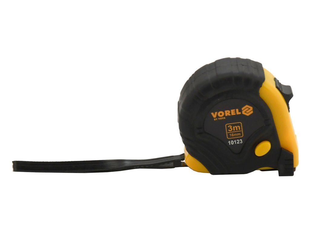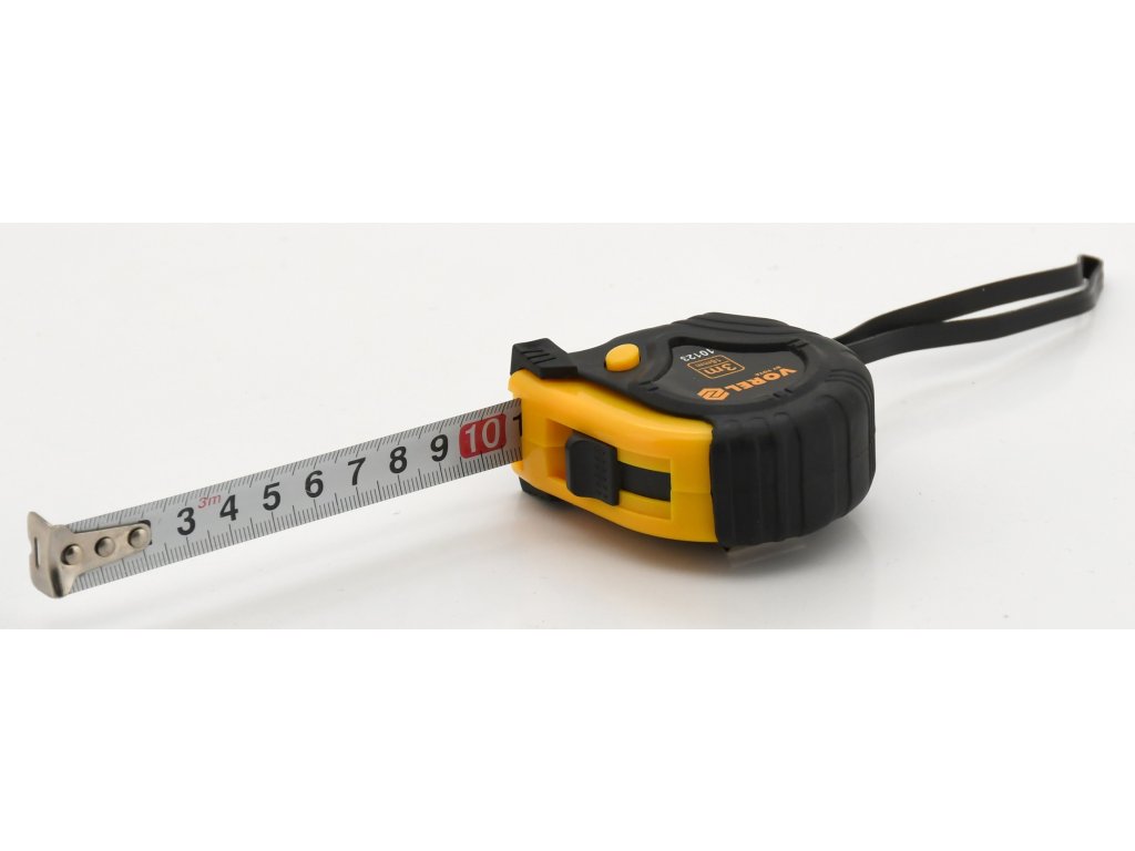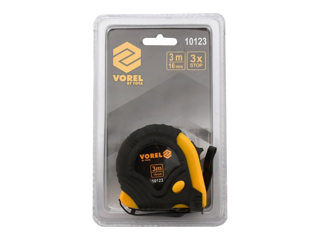 Svinovací metr 3 m dlouhý a 16 mm široký zakončený pohyblivým háčkem. Pouzdro je vyrobeno z plastu, vyztuženo gumovými podložkami a aretačním knoflíkem.