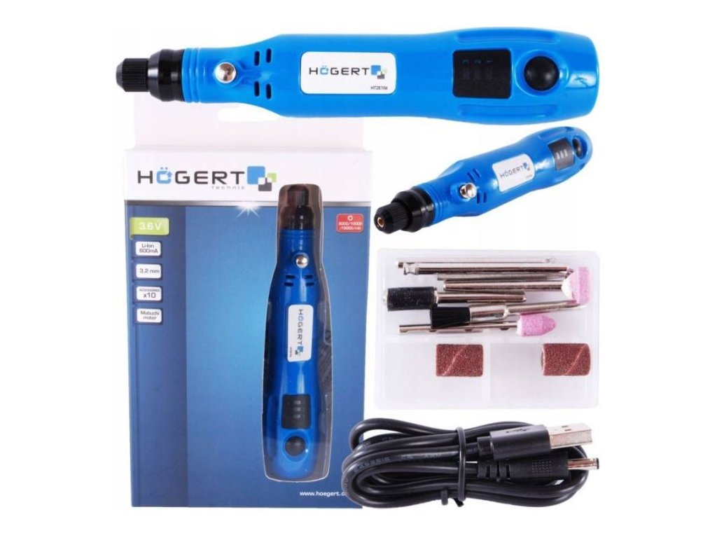 Mini bruska aku 3,6 V 600 mA 11dílů, HOGERT ¦ 3 rychlosti 5000/10000/15000 ot / min umožňují pohodlné ovládání a lepší ovládání;¦ bezpečnostní funkce - bruska se automaticky vypne, když je materiál zaklíněn;