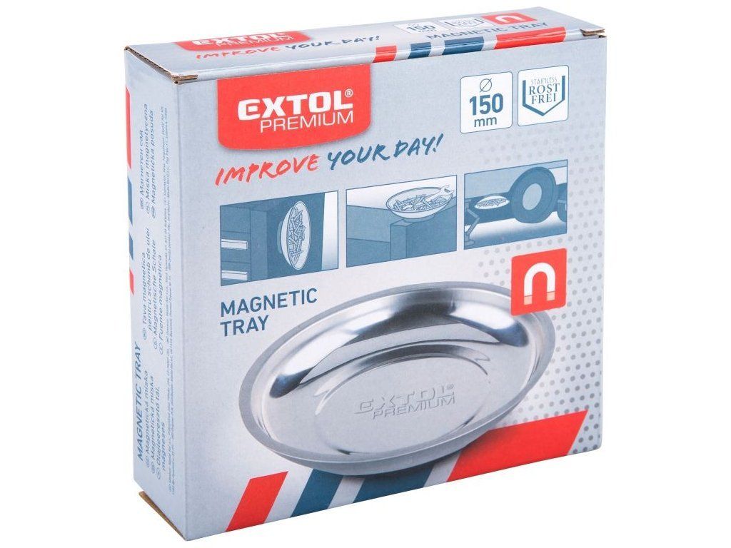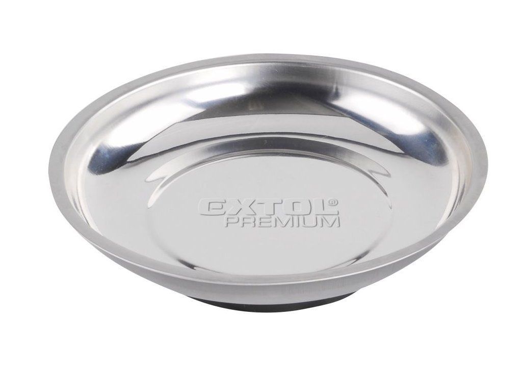 miska z nerezové oceli se silným magnetem na dně slouží k odkládání malých kovových předmětů, matek, šroubů a podložek, lze ji umístit v horizontální a vertikální poloze i dnem vzhůru na kovové povrchy, karoserie aut apod.