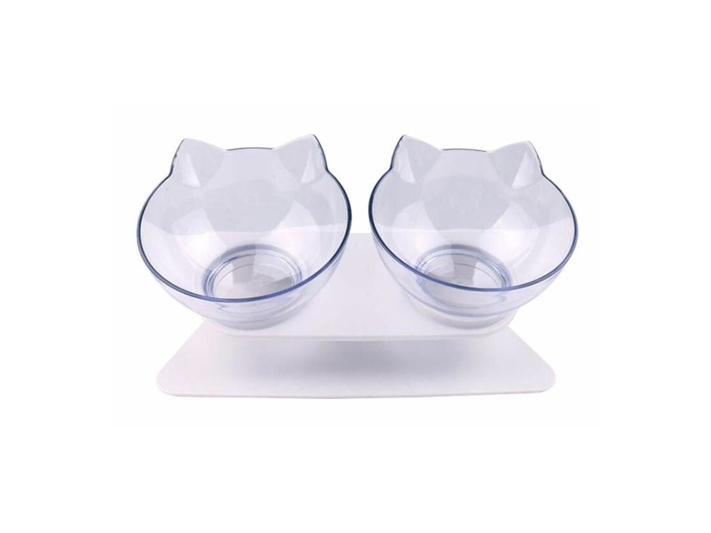Dvojitá miska na krmivo a vodu pro kočky. Misky jsou umístěny na speciálním stojanu, který je nakloněný pod úhlem 15 stupňů směrem ke zvířeti, což mu usnadňuje konzumaci vody a jídla. Promyšlená struktura stojanu zabraňuje vylití vody a rozhazování potravin. Průhledné misky usnadňují kontrolu množství jídla.