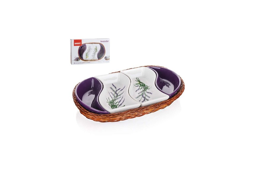 Proutěný košík má rozměry 30.5 x 18.5 cm s keramickými miskami 4 ks.Servírovací misky s dekorem levandule v proutěném košíku.