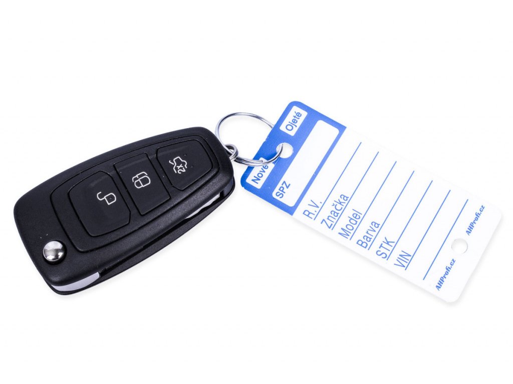 Bílé plastové visačky na klíče s modrým potiskem jsou velkou pomůckou převážně pro autobazary, případně autosalony pro snadnou identifikaci klíčů. Jednoduše pak poznáte, kterému autu klíček patří díky vyplněným polím na jmenovce. Permanentním fixem, který je přiložen jako dárek, napíšete na cedulku na klíče SPZ, rok výroby, značku, model a barvu vozu. Datum STK a VIN, zaškrtnete zda se jedná o nové či ojeté vozidlo. Použitím permanentního fixu nemusíte řešit smývání, ušpiněné prsty apod. Na klíče připevníte rozlišovač za pomoci přiloženého kroužku, což může být o trochu složitější než instalace u modelů Easy-ON, nebo Econo ID.