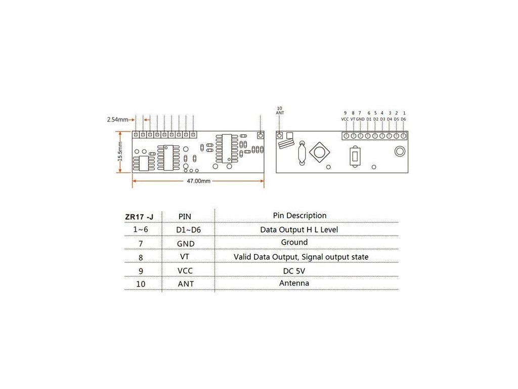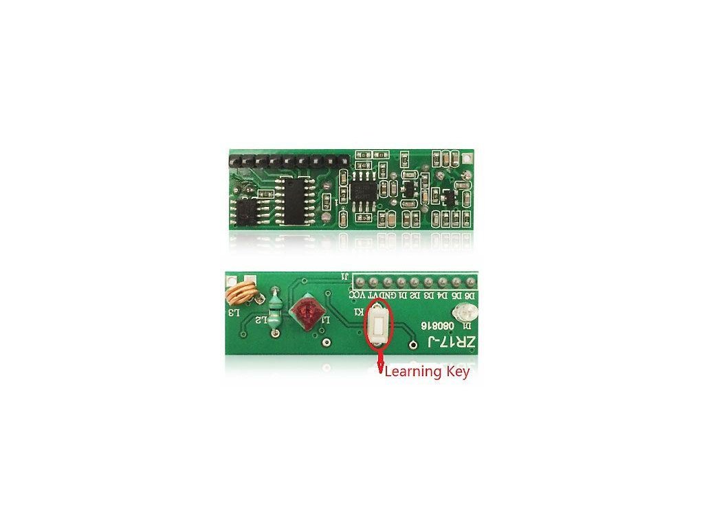 Modul dálkového ovládání ZR17J - přijímač 433MHz s učícím se kódem Bezdrátový přenos 433,92MHz, kódování EV1527, akceptuje rovněž kódování PT2262 , napájení 5V, spotřeba 3,7mA v chodu, výstup TTL, Rozměry: 47x16x9mm. Jednoduché párování učícím se kódem. Vhodný prodálkové ovládače s pevným kódem, např.T331-T332A nebo T336-T336B. **Nefunguje s modulem T340A**Manuál k produktu je ke stažení zde