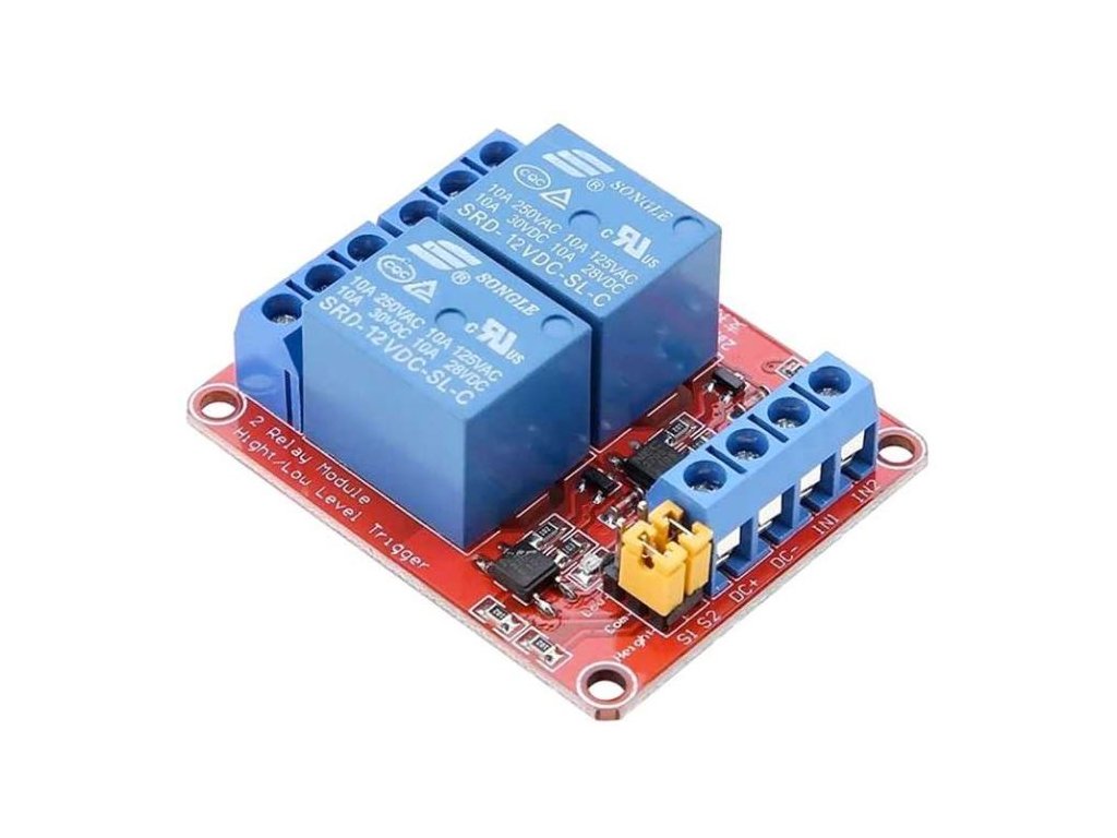 Modul s 2 relé s optickým oddělením napájený napětím 12V spouštěný volitelně vysokou nebo nízkou úrovní signálu. <BR/>**Specifikace:** <BR/>Relé: Songle SRD-12VDC-SL-C<BR/>Kontakt relé: 250VAC/10A <BR/>Spouštění:Low nebo High (5mA) volitelné propojkou<BR/>Opticky odděleno<BR/>Pracovní napětí: 12V<BR/>Pracovní proud: max.80mA <BR/>Klidový proud: 5mA<BR/>Rozměry: 50x41x18,5mmDoplňkové parametry