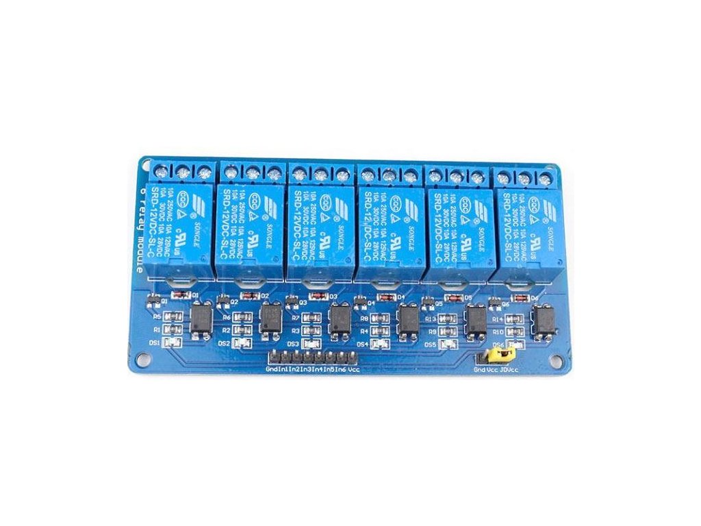 6 kanálový relé modul s napájecím napětím 24V osazen optočlenemSamotná relé se spínají uzemněním příslušného pinu.