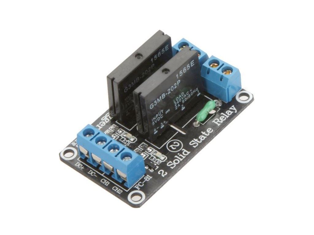 Modul s polovodičovými relé s napájecím napětím 5V a vysokoúrovňovým spínačem (logická 1)<BR/>**Specifikace:** <BR/>Napájecí napětí: 5VDC <BR/>Ovládané napětí: 240VAC / max.2A <BR/>Pojistka 2A <BR/>Spouštění: log.1(3,3-5V/2mA) <BR/>Rozměry: 105x52x23mmDoplňkové parametry