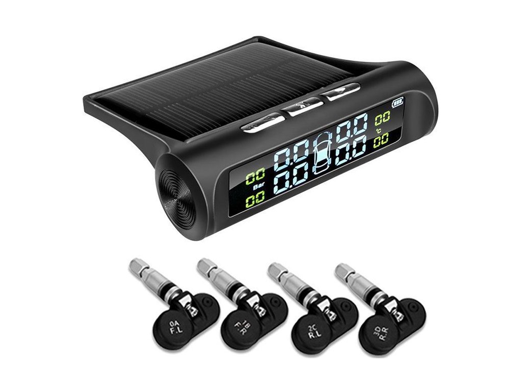 Snímače tlaku a teploty v pneumatikách TPMS je zařízení, umožňující měření tlaku a teploty uvnitř pneumatiky za jízdy a hlídání náhlých změn měřených hodnot, které jsou vždy důsledkem defektů nebo problémů s brzdami, např. váznoucími brzdovými třmeny. Mohou tedy předejít zničení pneumatiky a neustálou kontrolou hodnoty tlaků lze snadno předcházet jízdě na podhuštěných pneumatikách, což má příznivývliv především na spotřebu paliva. Snímače měří tlak a teplotu 1x za 3 minuty za předpokladu, že nedochází k prudkým změnám měřených hodnot. Pokud dojde k náhlému poklesu tlaku, vyšle čidlo okamžitěsignál a na displeji se objeví varovné hlášení doprovázené akustickým signálem.<BR/> <BR/>**Specifikace:** <BR/>Napájení centrální jednotky: baterie (nabíjení solárním panelem nebo z USB micro<BR/>Napájení snímačů: 1x baterie CR1632 pro každý snímač <BR/>Frekvence pro přenos signálu ze senzorů: 433,92MHz <BR/>Rozsah měření tlaku: 0-3,5Bar <BR/>Možnost volby mezi bary a PSI <BR/>Doba odezvy: 3 sekundy pro náhlé změnamy měřených hodnot <BR/>Pracovní teplota: -20 až 85°C <BR/>Rozměry centrální jednotky: 95x75x85mm <BR/><BR/>**Upozornění:**<BR/>U vnitřních senzorů je baterie doživotní, u venkovních se dá baterie vyměnit.Doplňkové parametry