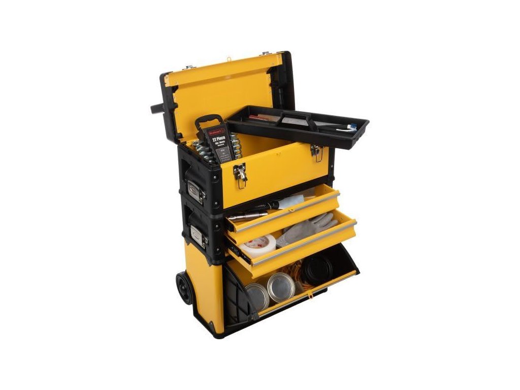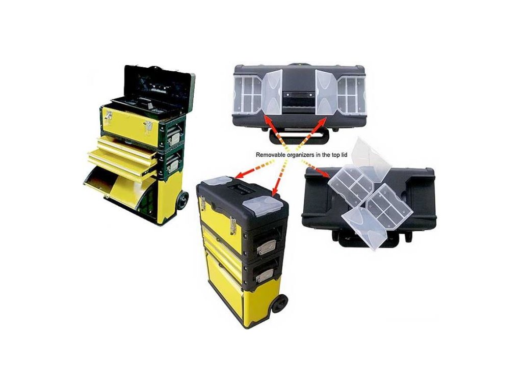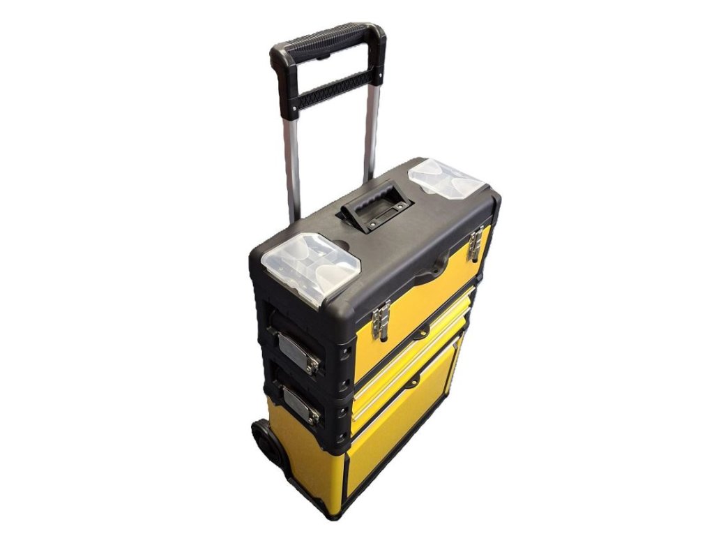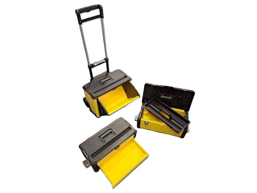 Montážní kufr 52x32x72cm kovový pojízdný Robustní pojízdný box na nářadí s rozměry 520x320x720mm má 3 části. Horní i prostřední díl lze použít samostatně i jako přenosný kufr. Prostřední díl má 2 výsuvné zásuvky bez dělení.Spodní část poskytuje velký výklopný úložný prostor bez dělení.