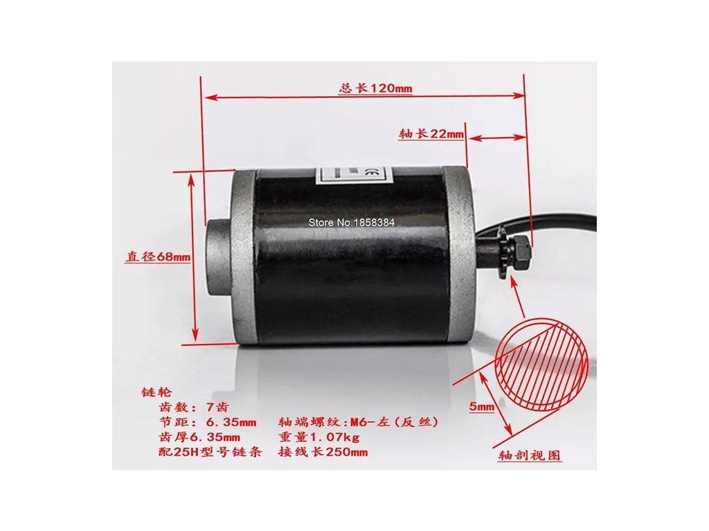 Motor MY6812 12V 120W pro elektrokoloběžky řetězové kolo 7 zubů, průměr hřídele 8mm