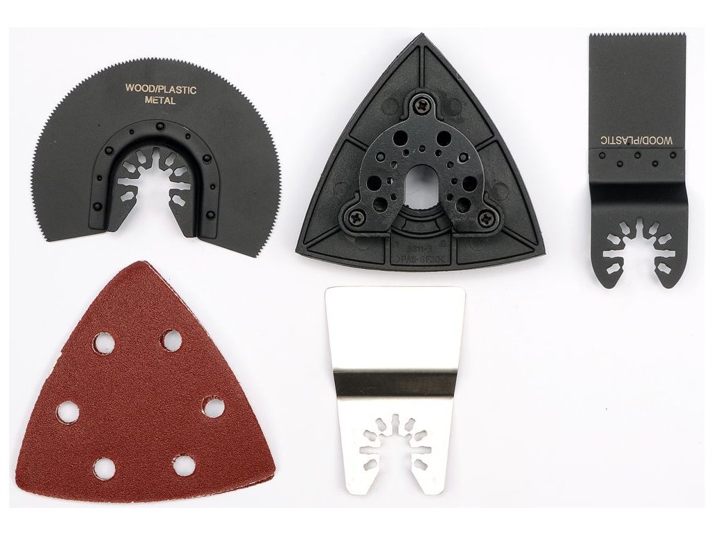 Nástroj umožňuje rychlou a snadnou výměnu příslušenství, které je součástí výrobku (segmentový pilový list 88 mm, pilový list na ponorné řezy 34 mm, škrabka 50mm, brusný nástavec trojúhelník, 2x brusné plátno trojúhelník).
