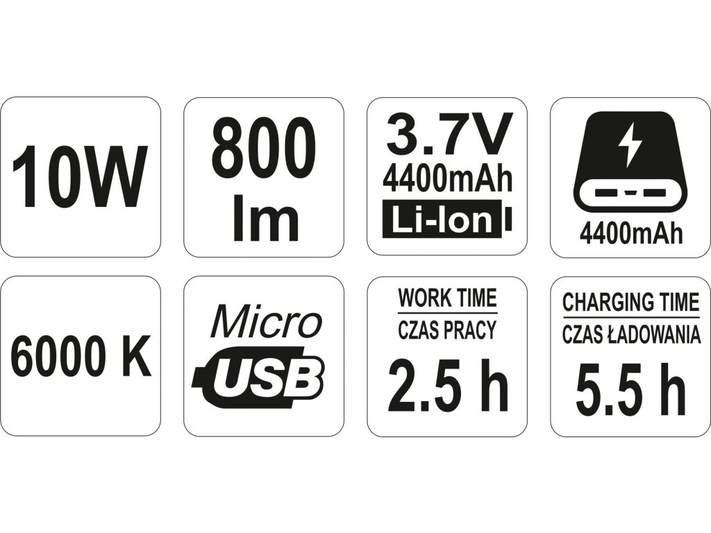 Díky použití COB LED s výkonem 10W je zajištěn vysoký světelný tok 800lm a vysoká životnost zařízení. Světlo má barevnou teplotu 6000K (studená bílá). Samotná dioda je opatřena odolnou optikou, chránicí před mechanickým poškozením, usazováním prachu a jiných nečistot, ale i zlepšení charakteristiky osvětlení.