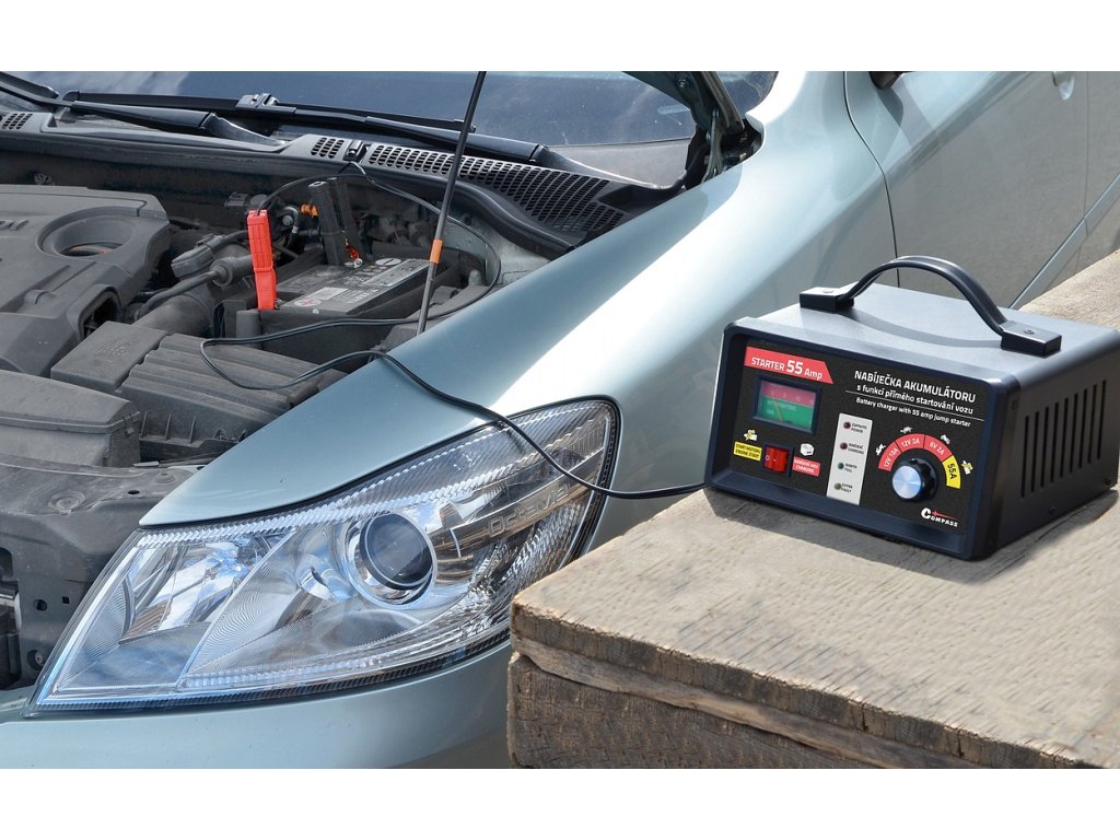 Funkce STARTER 55 Amp umožňuje nastartovat vozidlo s vybitou baterií tak, jako kdy bylo startováno pomocí startovacích kabelů z jiného vozidla.