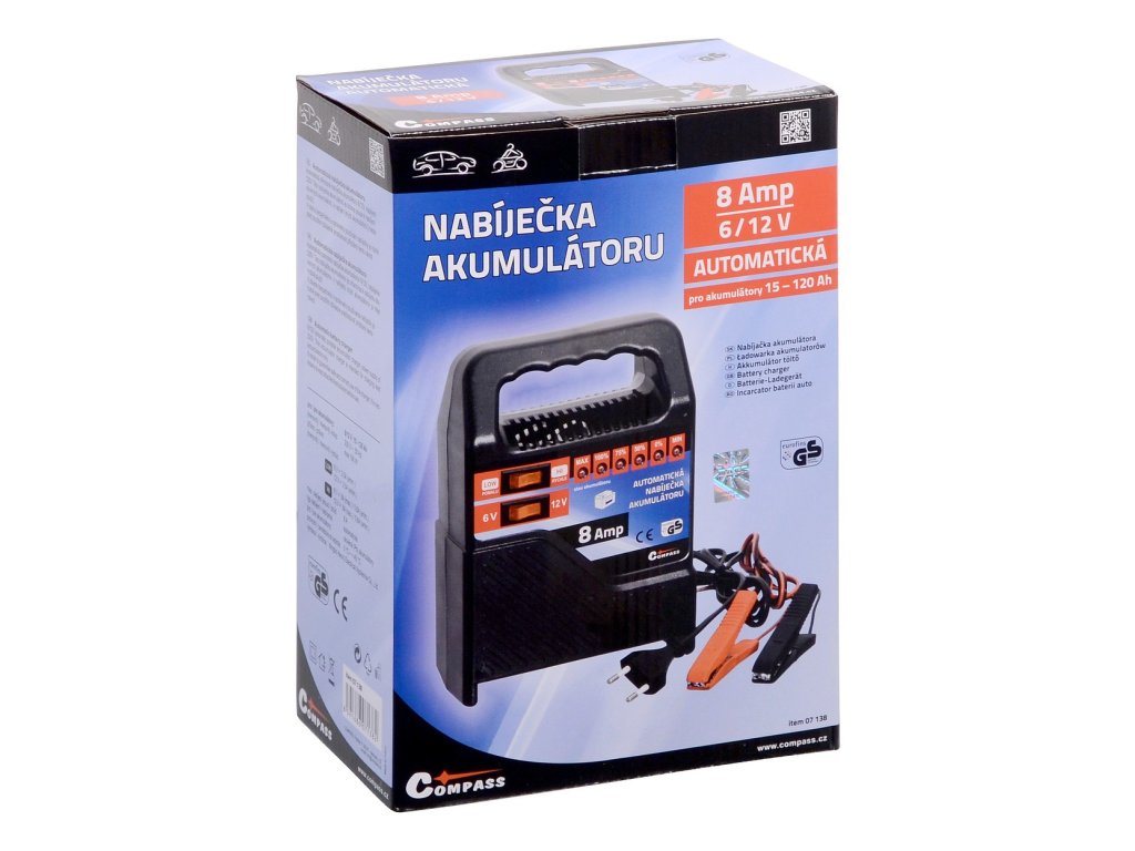 Přenosná automatická nabíječka akumulátoru 6/12V 8A, napájení 230V. Pro akumulátory 6/12V 15-120Ah, max. nabíjecí proud 8A. Baleno v barevné krabici. Homologace GS/TUV