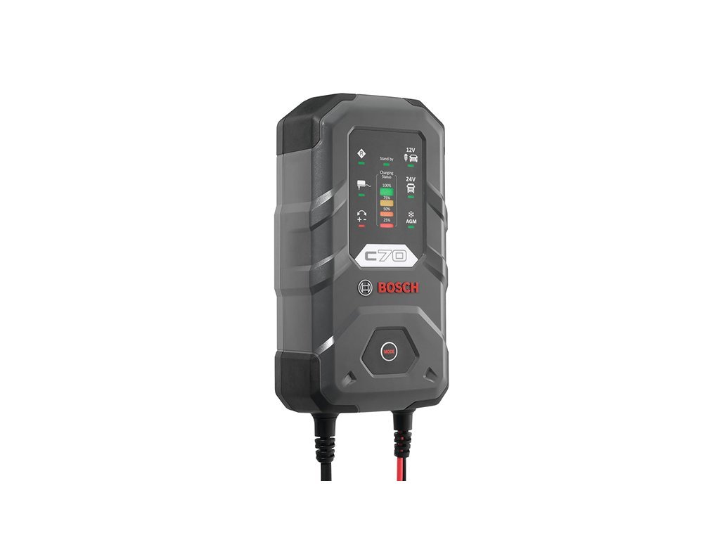 Automatická nabíječka BOSCH C70 je určena pro širokou škálu olověných akumulátorů, včetně údržbových i bezúdržbových VRLA baterií. Podporuje typy WET, EFB, AGM i GEL. Tato nabíječka je ideální pro vozidla s 12V akumulátory o kapacitě 14–300 Ah a 24V akumulátory o kapacitě 14–120 Ah.