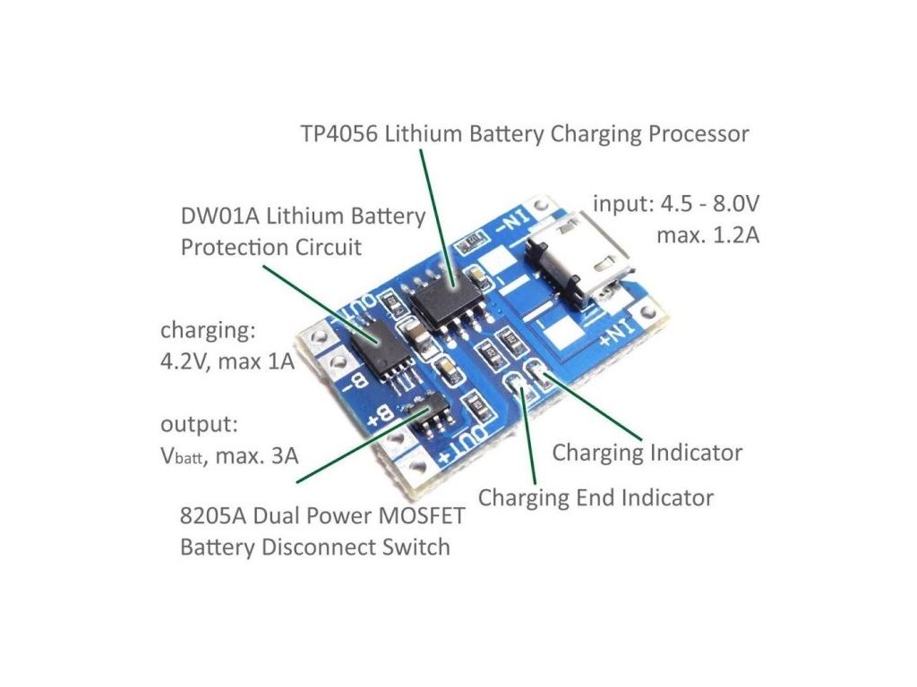 - rekondiční nabíjení proudem 130mA v případě, že úroveň svorkového napětí článku je <2,9V. Po dosažení tohoto napětí modul nabíjí jmenovitým proudem až do 1A
